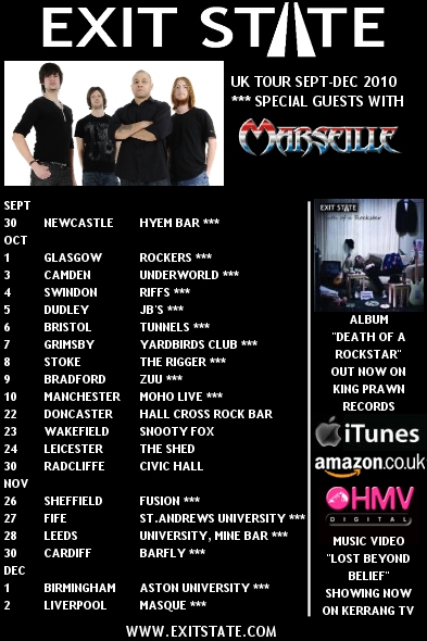 June 28th : Exit State : delighted to confirm UK Tour dates Sept-Dec 2010, including 16 gigs as special guests with NWOBHM legends Marseille. Tour flyer HERE